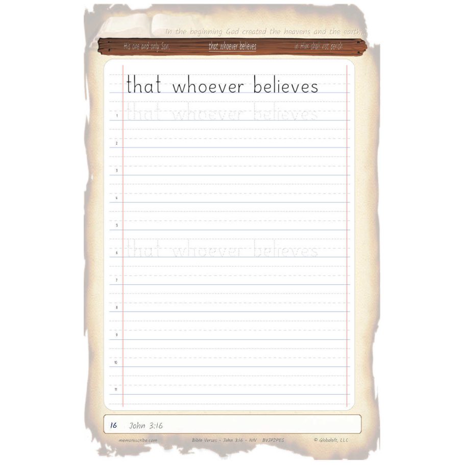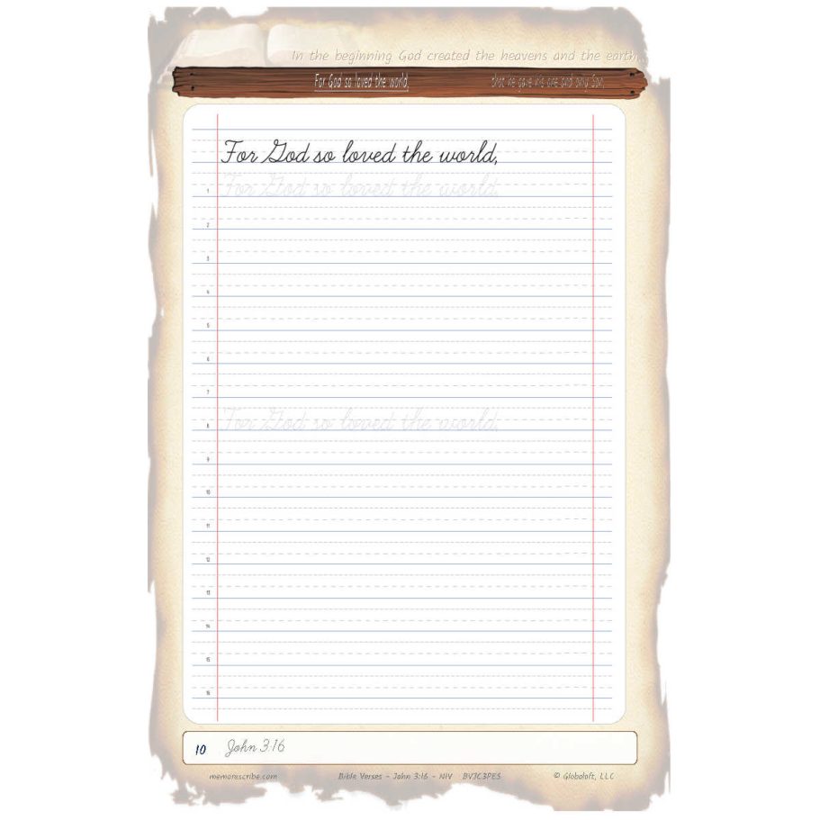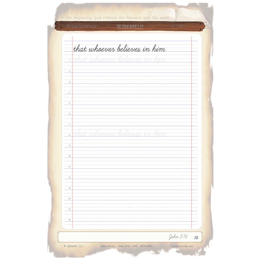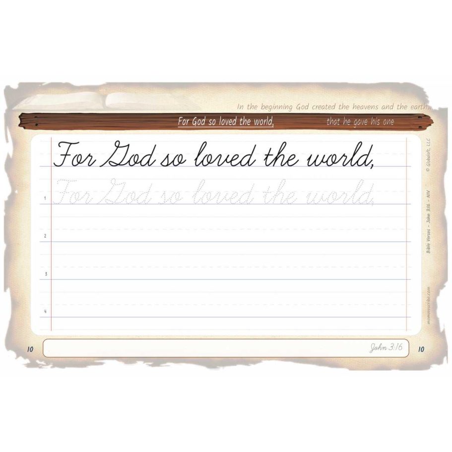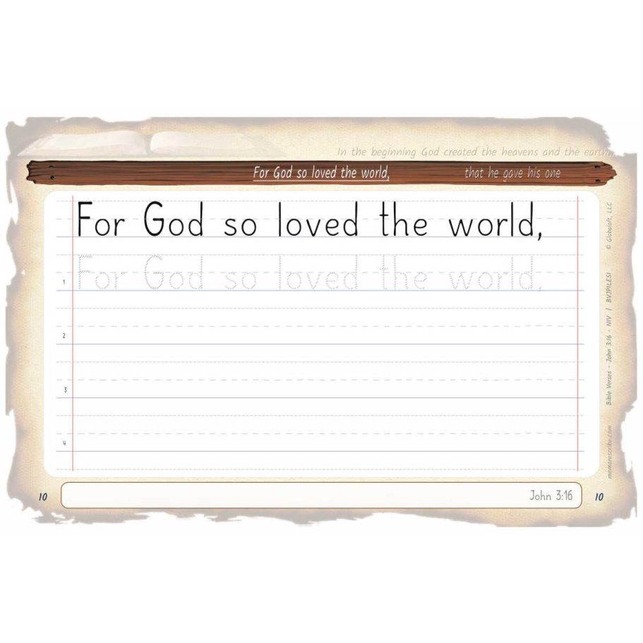Writers will enjoy practicing and developing their personal, unique handwriting style with easy-to-follow exercises while they learn and review the Bible Verse John 3:16 (NIV).