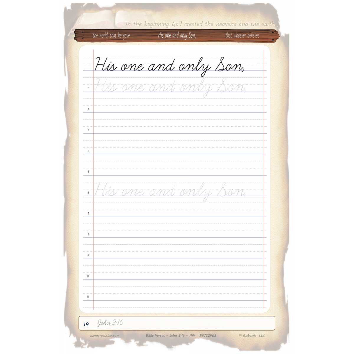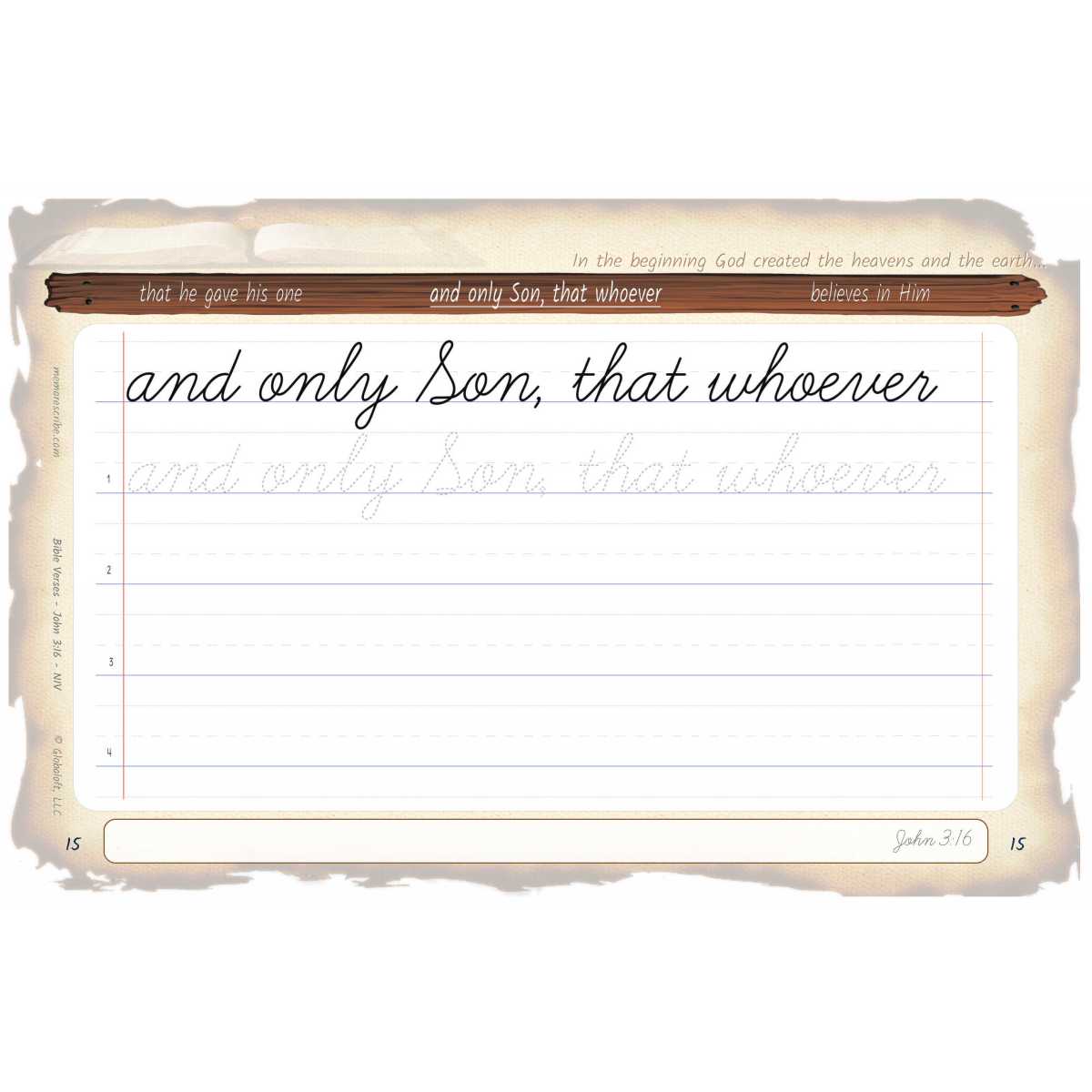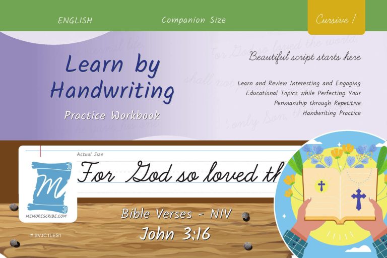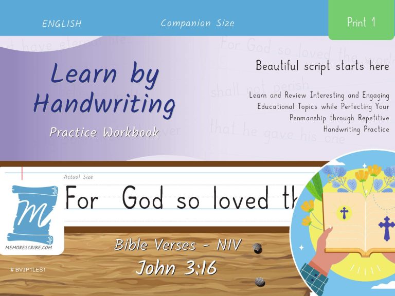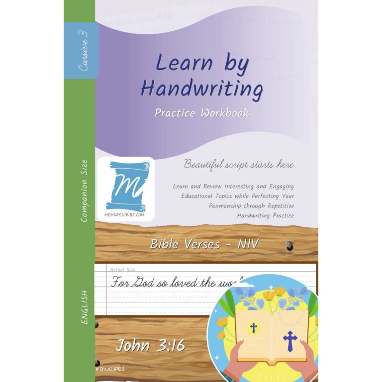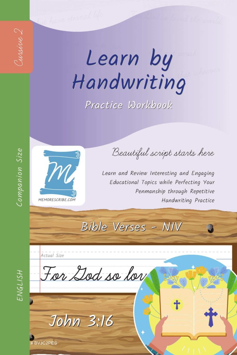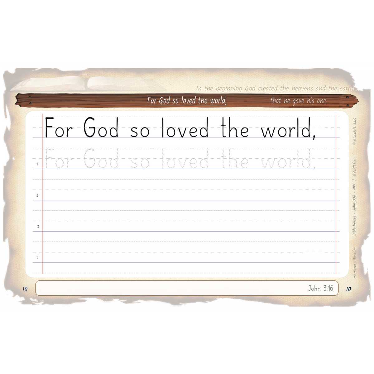 Writers will enjoy practicing and developing their personal, unique handwriting style with easy-to-follow exercises while they learn and review the Bible Verse John 3:16 (NIV).