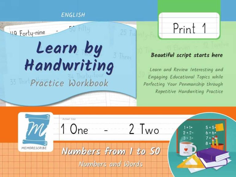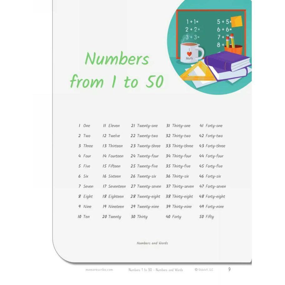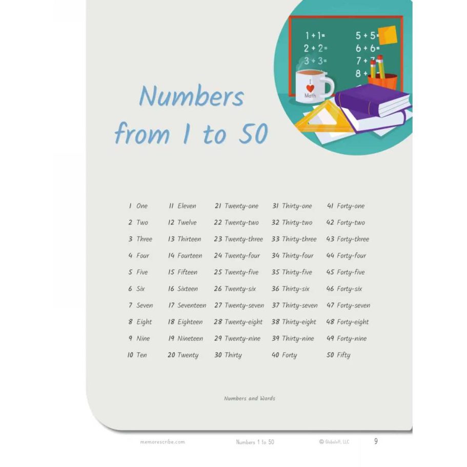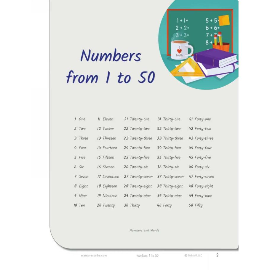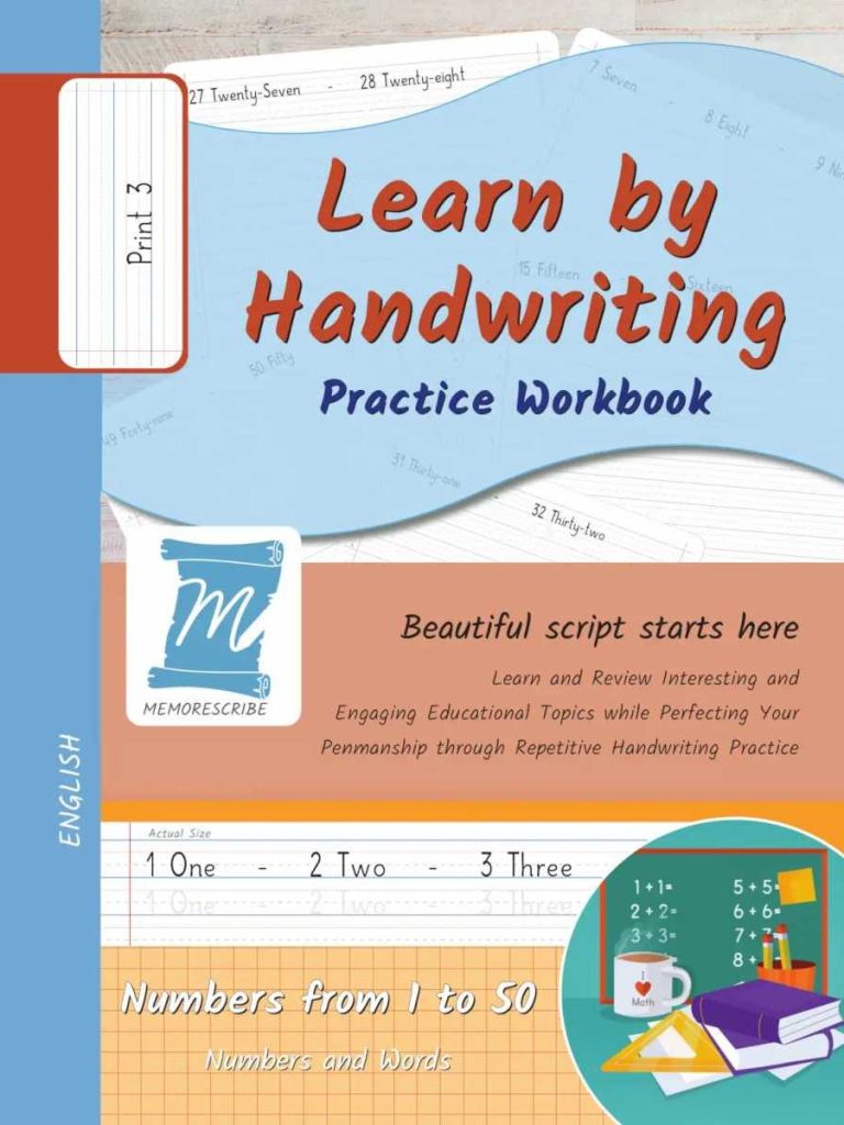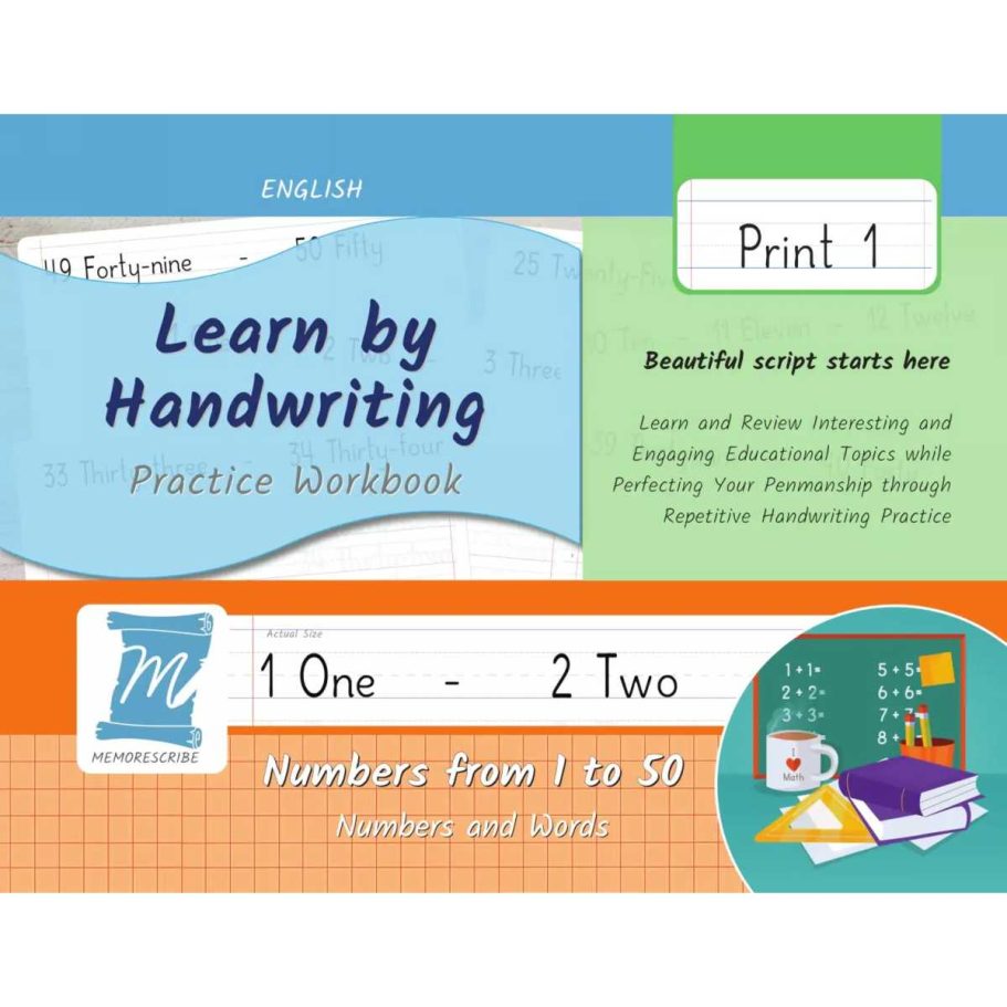 Writers will enjoy practicing and developing their personal, unique handwriting style with easy-to-follow exercises while they learn and review Numbers from 1 to 50, in words and numbers.