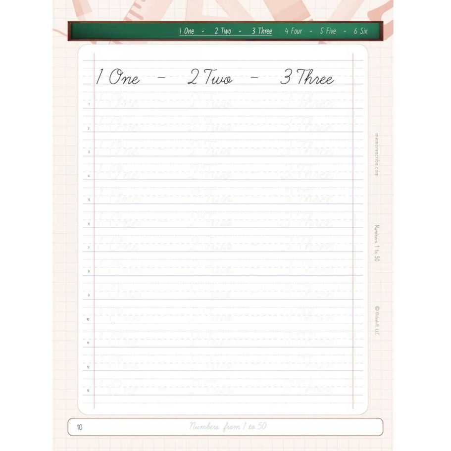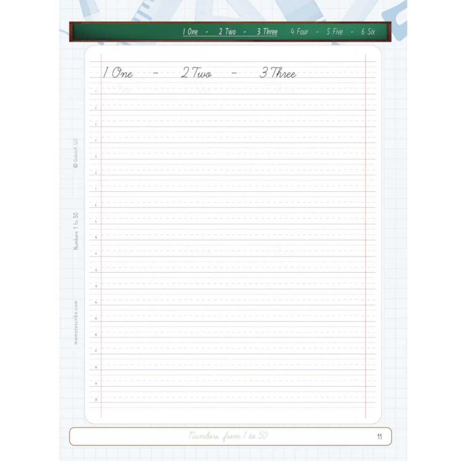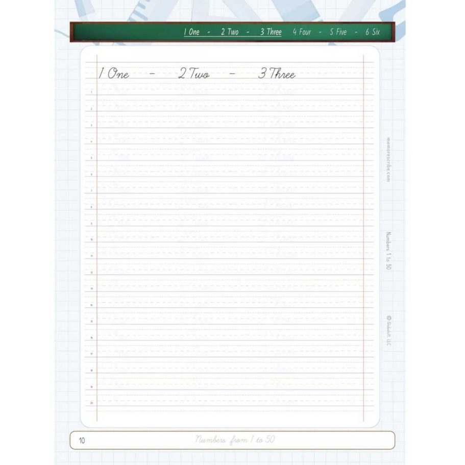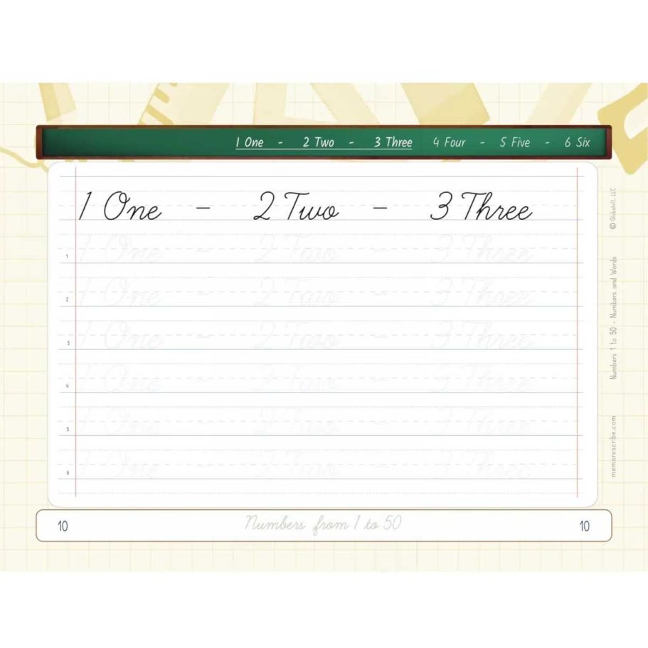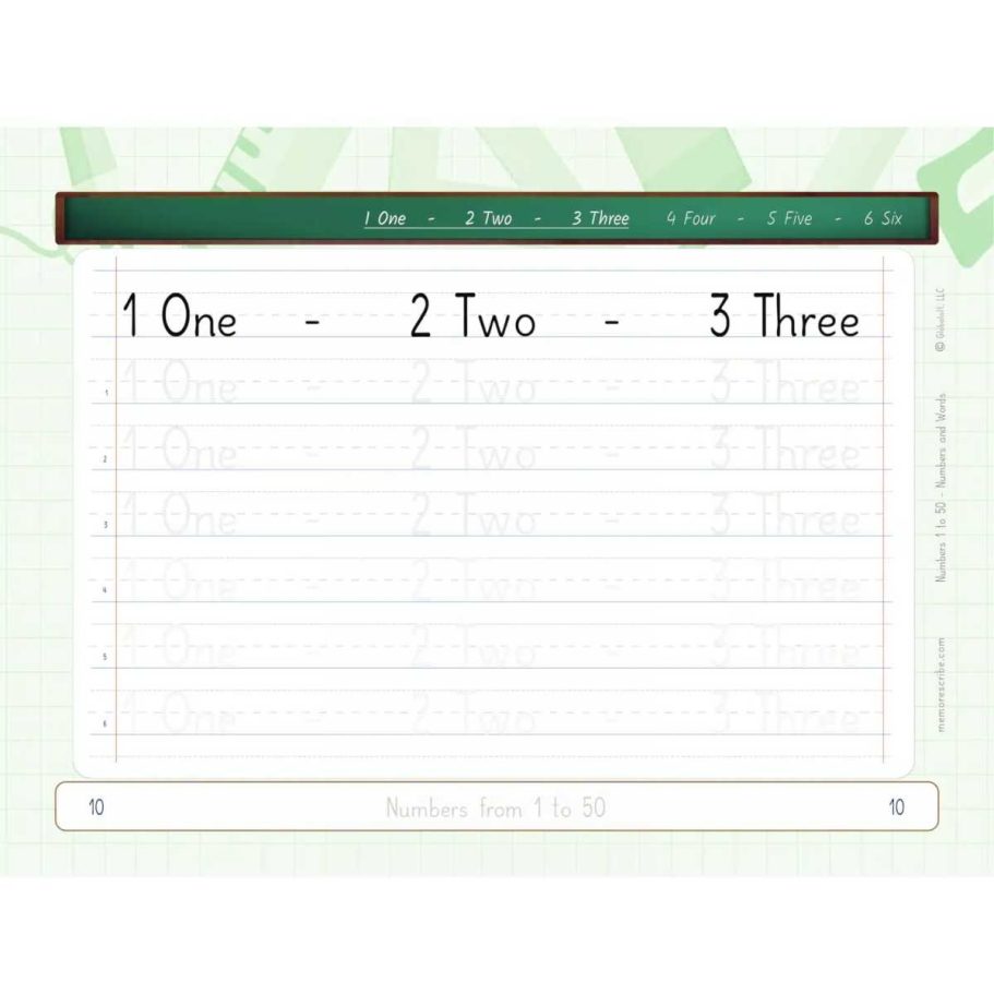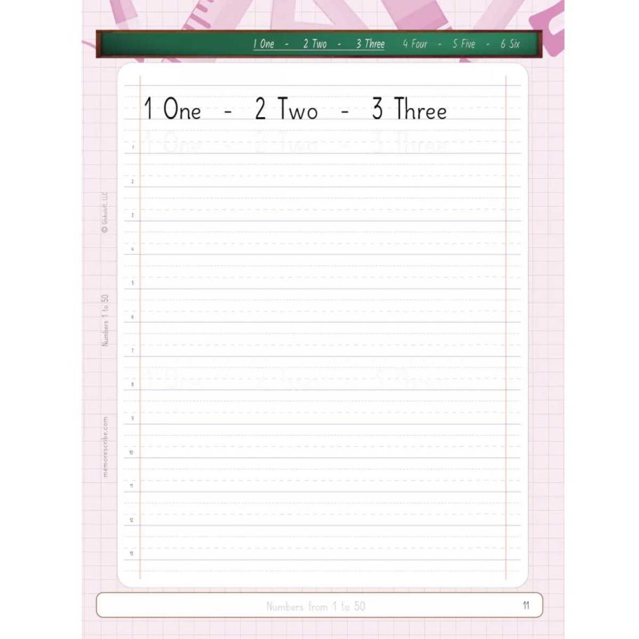 Writers will enjoy practicing and developing their personal, unique handwriting style with easy-to-follow exercises while they learn and review Numbers from 1 to 50, in words and numbers.
